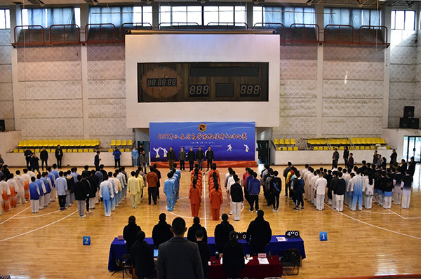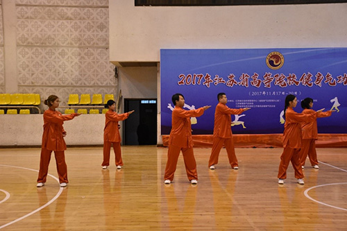 11月18日,2017年江苏省高等院校健身气功比赛在我校后藤体育馆隆重举行。江苏省体育局社会体育管理中心书记、省气功办主任赵玉坤,我校党委副书记、副院长王荣,东南大学体育系副主任王青禾、副教授李晓智,我校学生处副处长、团委书记潘明烽等出席开幕式,江苏省社体中心健身气功部部长李伟主持。来自全省23所高校159名运动员、教练员参加此项赛事。